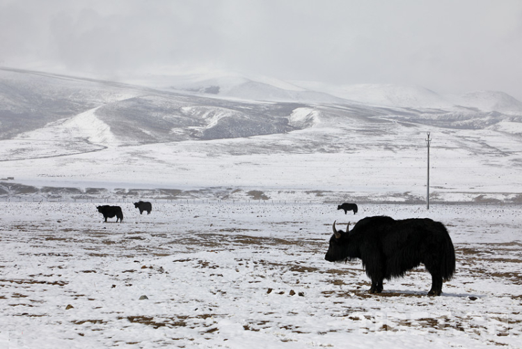 時已暮春,但在高寒牧區(qū)天然草場,草還沒發(fā)芽,洛絨赤乃只好讓牛在雪地里啃冬天留下的枯草。雖然定居點牛棚里有儲存的人工飼草,但還是要備不時之需,因為春夏之交還會經(jīng)常下雪,也是牦牛最難熬的時節(jié)。