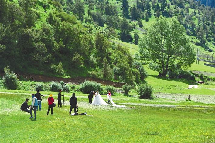 圖為一對新人在伊日峽谷拍攝婚紗照。記者 扎巴旺青 攝