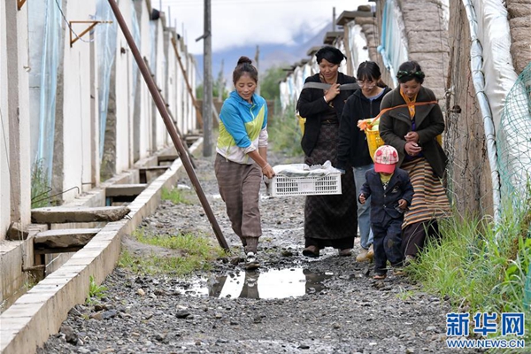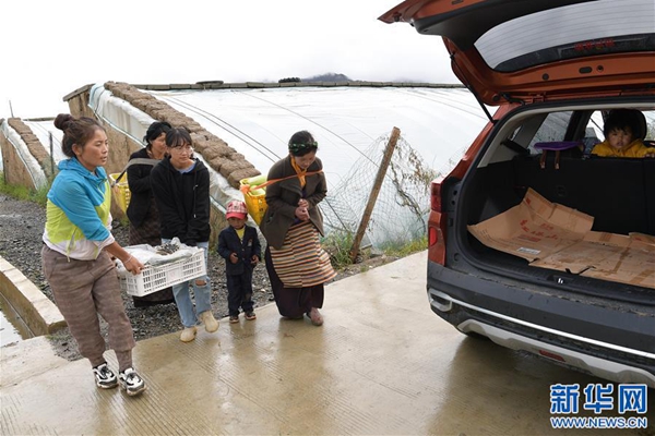 格桑旺姆(左三)和姐姐德吉卓瑪(左一)帶領(lǐng)雇傭的殘障村民巴珍(右一)搬運(yùn)大棚出產(chǎn)的新鮮蔬菜(8月3日攝)。