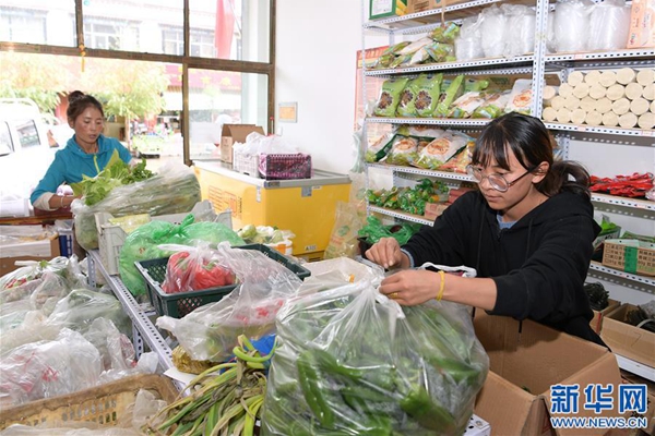格桑旺姆(右)和姐姐德吉卓瑪在位于白朗縣的蔬菜店內(nèi)忙碌(8月3日攝)。