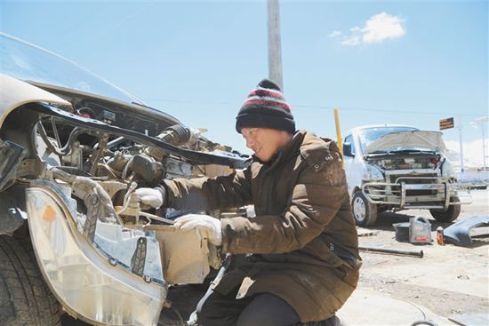 西熱次仁正在修理汽車。盧文靜 攝