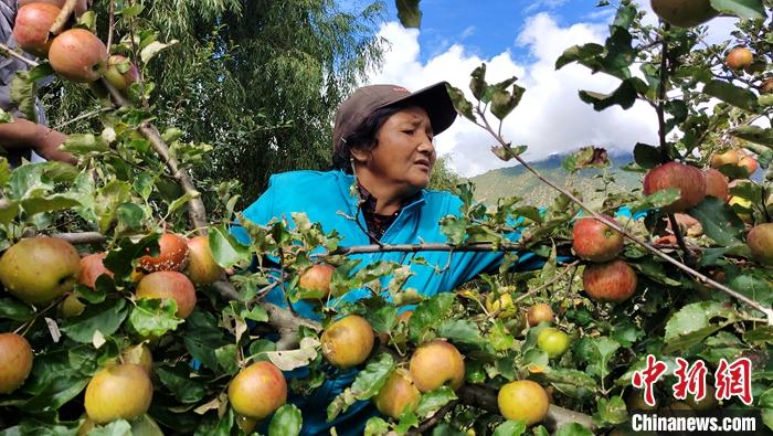 圖為10月6日,西藏林芝市米林縣參與種植蘋果的農民采摘蘋果。中新社記者 貢桑拉姆 攝