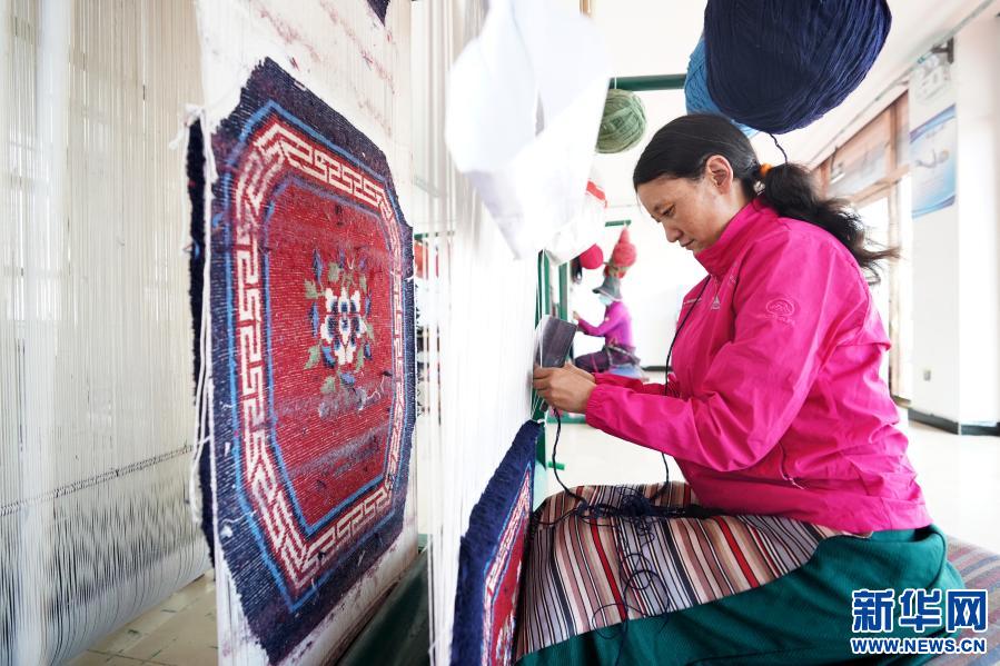 西藏阿里地區(qū)改則縣麻米鄉(xiāng)村民崗增在噶爾縣康樂新居服裝地毯加工廠里工作(7月25日攝)。2017年,崗增和家人搬遷到噶爾縣康樂新居易地扶貧搬遷安置點(diǎn),住進(jìn)了125平方米的新居。崗增還就近在安置點(diǎn)的服裝地毯加工廠找到了工作,每個月有3000元左右的收入。新華社記者 詹彥 攝
