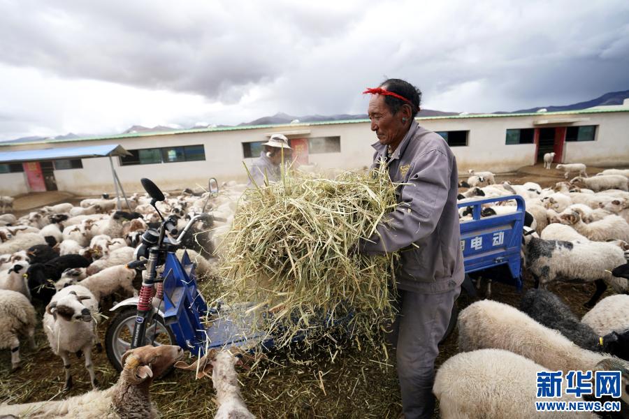西藏日喀則市定日縣克瑪鄉(xiāng)幫布村村民頓珠在定日縣珠穆朗瑪崗巴羊規(guī)?;B(yǎng)殖產(chǎn)業(yè)園喂羊(7月31日攝)。頓珠2020年來到產(chǎn)業(yè)園打工,負(fù)責(zé)喂羊、打掃羊舍,每個月有3500元的收入。新華社記者 詹彥 攝