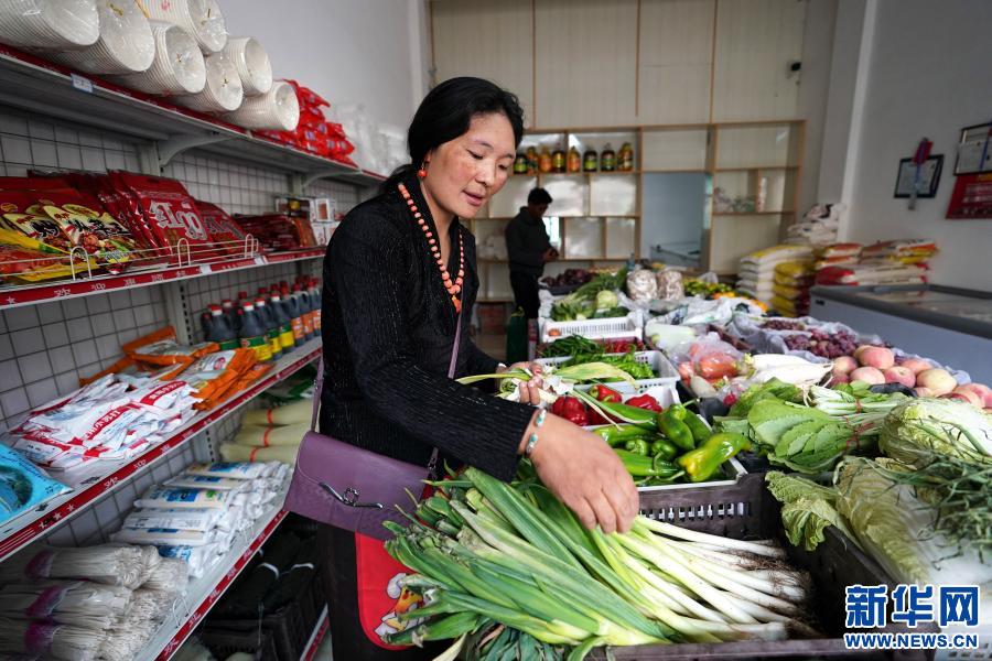 在西藏昌都市類烏齊縣桑多扶貧開發(fā)區(qū)易地扶貧搬遷安置點(diǎn),長毛嶺鄉(xiāng)達(dá)雄村村民阿?。ㄇ埃┖驼煞蚨斫鹪谑卟说昀镎硎卟耍?月22日攝)。2018年,阿丁和家人從達(dá)雄村搬遷到安置點(diǎn),住進(jìn)了100平方米的新居。搬到安置點(diǎn)后,阿丁和丈夫租了一間40多平方米的店面,做起了蔬菜生意。新華社記者 詹彥 攝