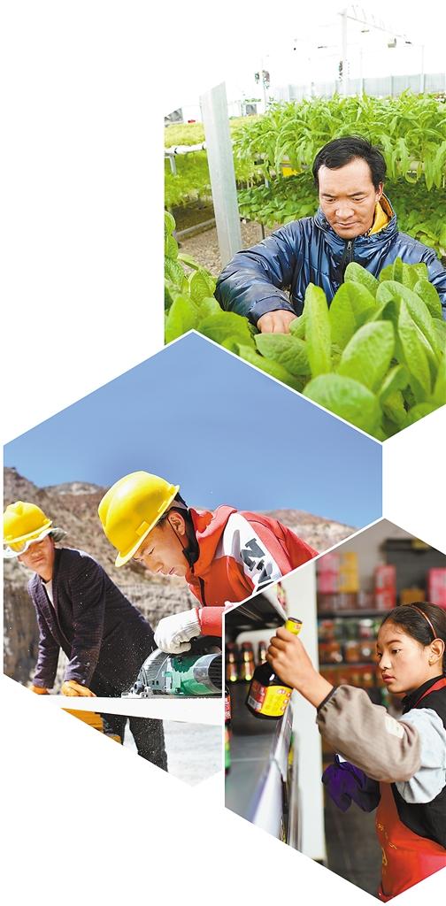 ?、僭诟翣柨h生態(tài)農(nóng)業(yè)產(chǎn)業(yè)園內(nèi),噶爾縣左左鄉(xiāng)上左左村村民宿加在查看蔬菜生長(zhǎng)情況。 ②八宿縣擁巴鄉(xiāng)村民格松旺扎(右)在八宿縣西巴村小型磚廠里忙碌。 ③丁青縣尺牘鎮(zhèn)烏巴村村民斯朗德吉在尺牘鎮(zhèn)的一家超市里打工。新華社記者 詹彥 攝