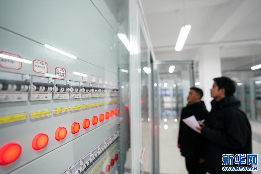 在西藏阿里與藏中電網(wǎng)聯(lián)網(wǎng)工程薩嘎220千伏變電站,工作人員查看設(shè)備運行情況(2020年11月27日攝)。新華社記者 詹彥 攝