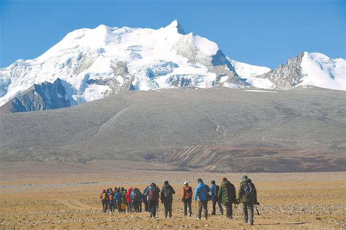 圖為希夏邦馬雪山下,戶外運動的人們在向?qū)ьI(lǐng)下徒步。記者 李洲 攝