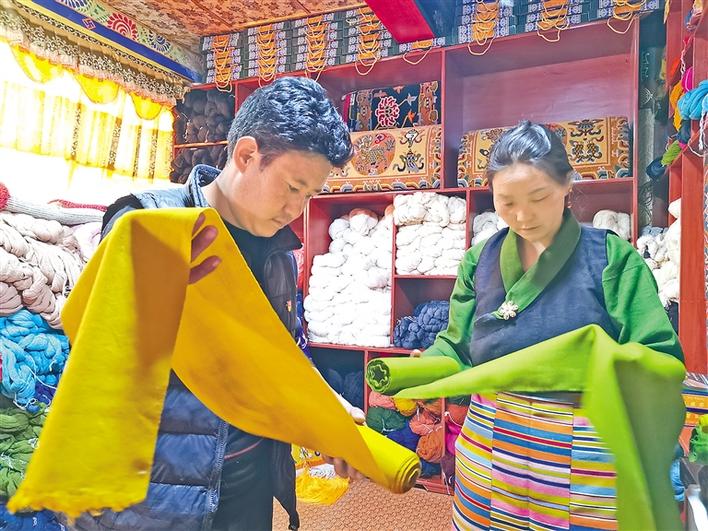 日喀則市仁布縣德吉林鎮(zhèn)德旦康薩傳統(tǒng)手工業(yè)農(nóng)牧民專業(yè)合作社負責人旦真正在查看產(chǎn)品質(zhì)量。記者 扎西頓珠 攝