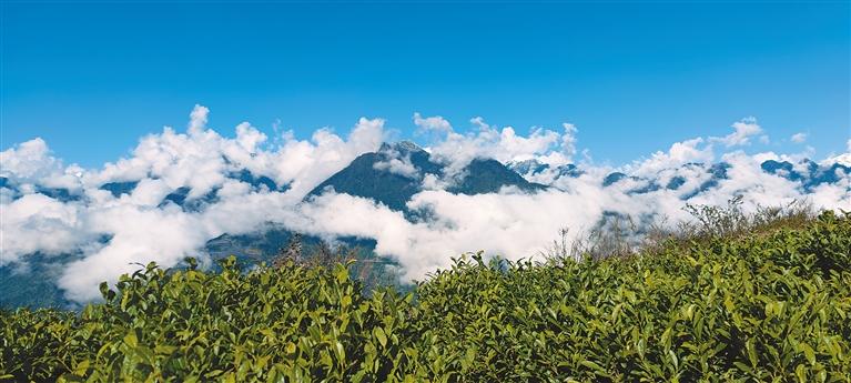 云霧縹緲、雪山環(huán)繞的格林村百畝茶園。本報(bào)記者 高玉潔 攝