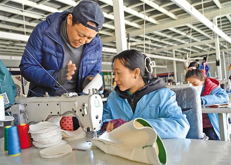 圖為西藏古傳民族手工業(yè)有限公司的老師在教授學員縫紉技巧。記者 洛桑 攝