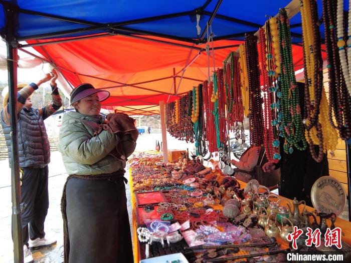 圖為尼瑪拉措在林芝市米林縣的南迦巴瓦觀景臺上擺攤賣貨。 西藏自治區(qū)交通運輸廳供圖