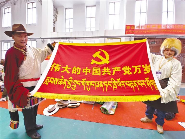 也有不少牧民,希望把藏北牧民愛黨愛國愛家鄉(xiāng)的熱情注入到傳統(tǒng)工藝當中。在比賽現場,記者看到很多牧民在傳統(tǒng)的氆氌和背包上刺繡、拼貼出黨徽、國旗、天安門等圖案,或繡出“偉大的中國共產黨萬歲”“鄉(xiāng)村振興那曲奮進”等字樣。