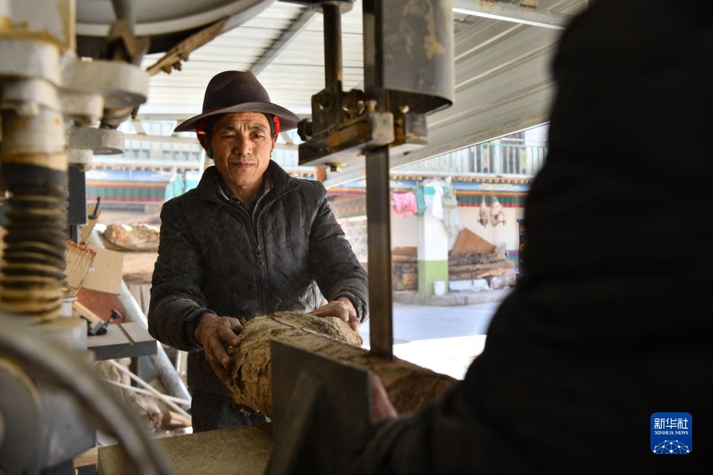 索朗瓊拉在切割制作扎念琴的木材原料(1月19日攝)。新華社記者 晉美多吉 攝