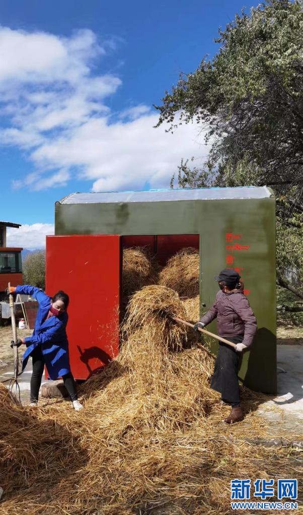 巴宜區(qū)拉丁嘎三村村民正在將秸稈填入有機垃圾生態(tài)處理箱。