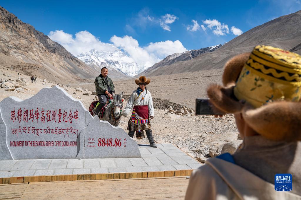在珠峰大本營的珠峰高程測(cè)量紀(jì)念碑前,游客拍照留念(5月20日攝)。新華社記者 孫非 攝