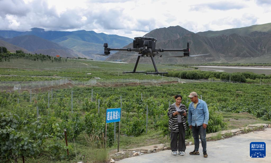 7月26日,桑日縣一家葡萄酒企業(yè)的員工曲珍(左)在葡萄園里向技術(shù)員何志榮學(xué)習(xí)使用農(nóng)用無人機(jī)。新華社記者 姜帆 攝