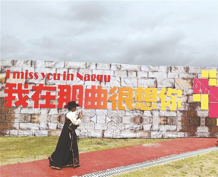 盛裝參加賽馬節(jié)的群眾經(jīng)過“我在那曲很想你”打卡點(diǎn)。