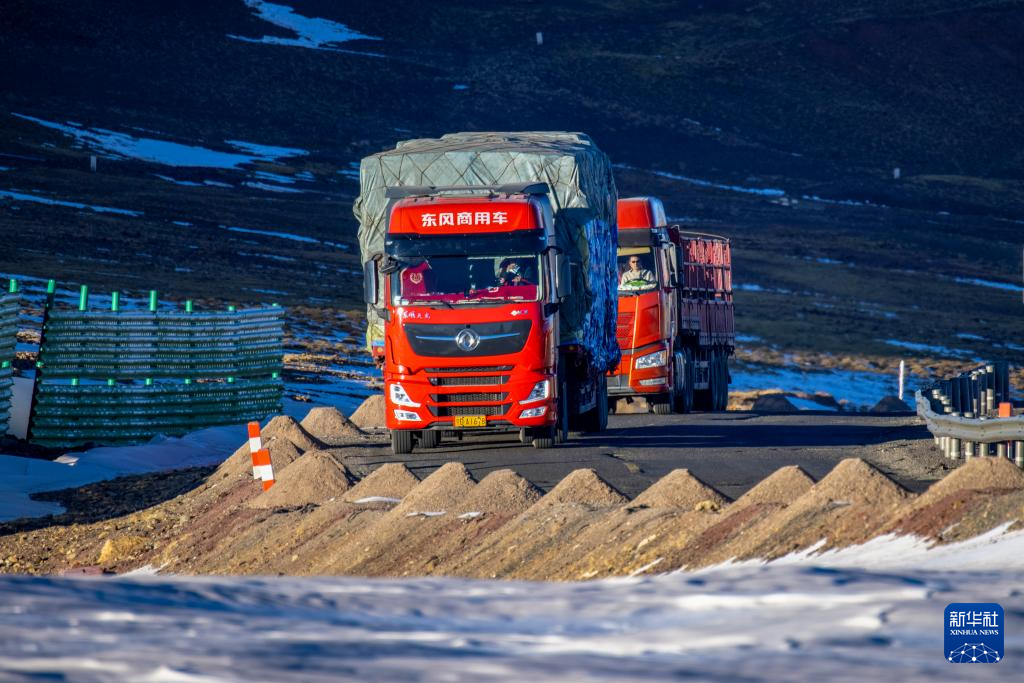 運載著申扎縣供銷合作社為偏遠鄉(xiāng)鎮(zhèn)果蔬配送試點項目從西寧采購的50噸新鮮果蔬的貨車經(jīng)過唐古拉山口(1月3日攝)。新華社記者 曹檳 攝