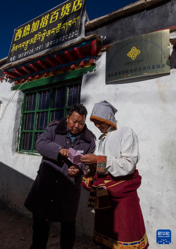 申扎縣供銷合作社的配送負責(zé)人吳瓦(左)與馬躍鄉(xiāng)貝嘎四村偏遠鄉(xiāng)鎮(zhèn)果蔬配送試點項目直銷點店主西熱加措核對配送清單(1月5日攝)。新華社記者 姜帆 攝