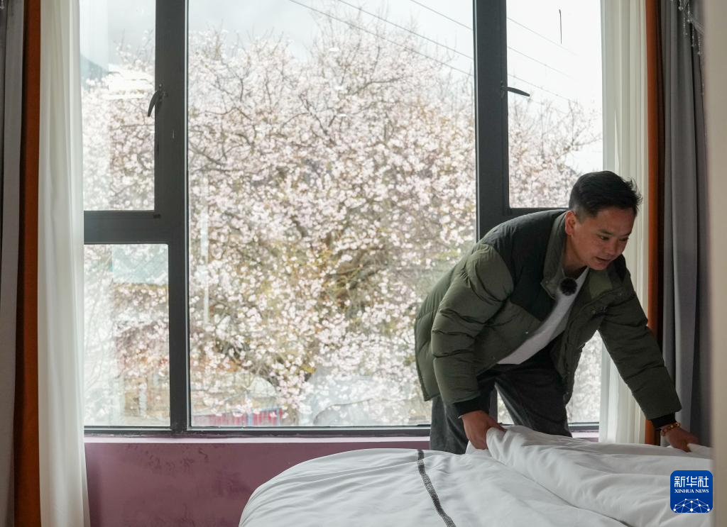 洛松頓珠在自家民宿內(nèi)整理房間(4月2日攝)。新華社記者 丁汀 攝