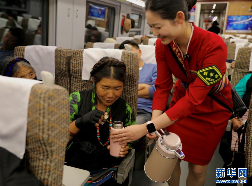 拉薩開往日喀則C885次列車長(zhǎng)為旅客送開水。新華社發(fā)(馬生明 攝)