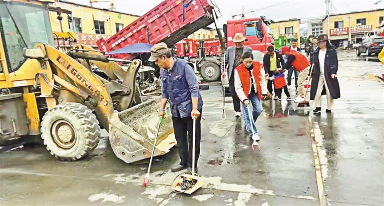 巴宜區(qū)尼池社區(qū)的工作人員身穿紅馬甲,手拿鐵鍬、掃帚等工具對林芝市快修市場附近的垃圾雜物進(jìn)行清理,“黨建引領(lǐng)聚合力 環(huán)境整治我先行”的標(biāo)語迎風(fēng)飄揚(yáng);