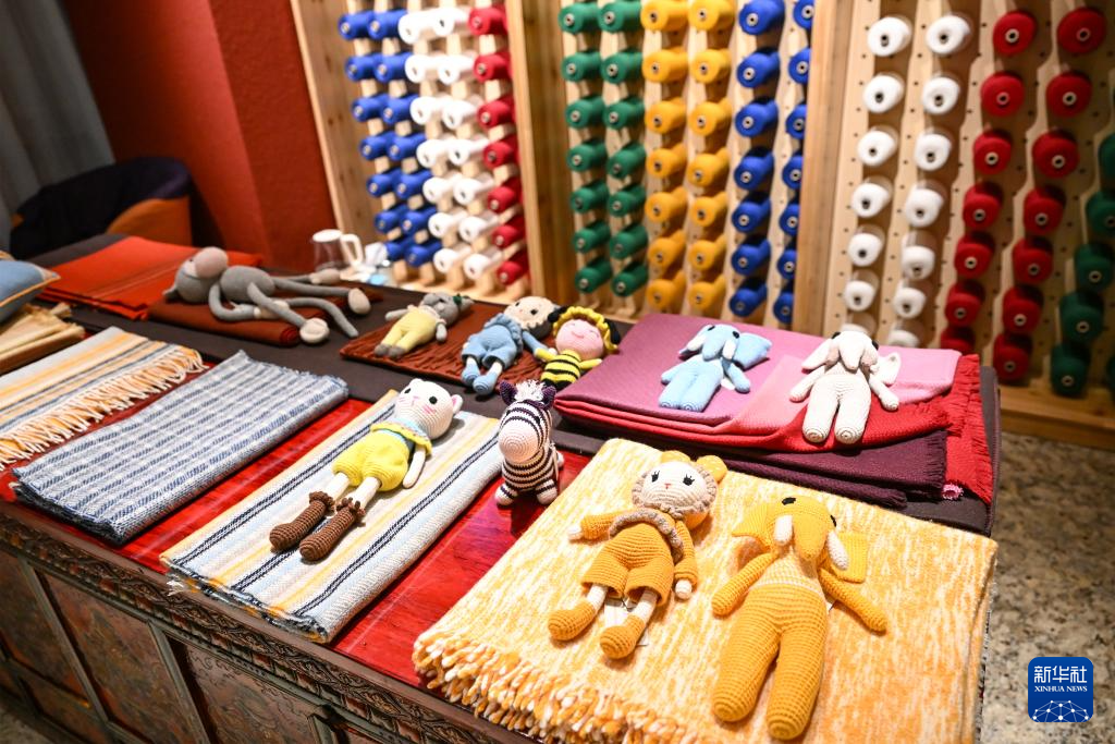 這是在西藏日喀則市一間門店拍攝的玩偶、圍巾、披肩等江孜氆氌產(chǎn)品(9月1日攝)。新華社記者 孫瑞博 攝