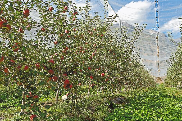 寬行密植有利于機(jī)械化生產(chǎn),多功能網(wǎng)室減免了套袋的人工和時(shí)間成本,水肥一體化灌溉系統(tǒng)能有效節(jié)水節(jié)肥……標(biāo)準(zhǔn)化種植的基地里,充滿了現(xiàn)代科技感。據(jù)介紹,目前,增巴村蘋果種植基地畝產(chǎn)量在5000斤左右,明年進(jìn)入豐產(chǎn)期后,能達(dá)到每畝8000斤的產(chǎn)量。
