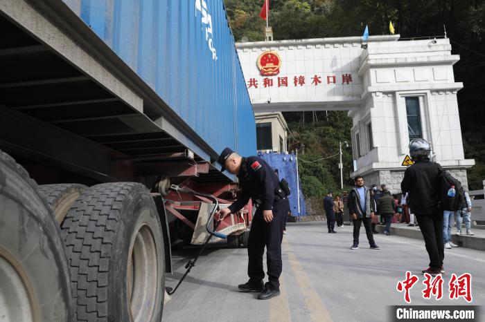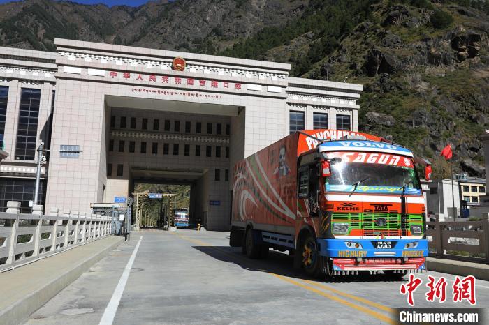 圖為尼泊爾貨車從吉隆口岸國(guó)門(mén)經(jīng)過(guò)。肖富貴 攝