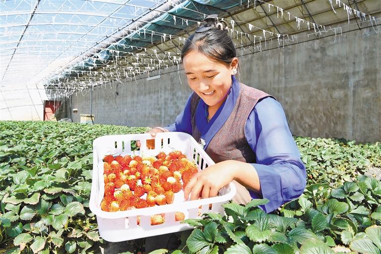 圖為拉薩市尼木縣吞彌現(xiàn)代農業(yè)產業(yè)園區(qū)草莓大棚內,工作人員在采摘草莓。記者 洛桑 王敏 攝