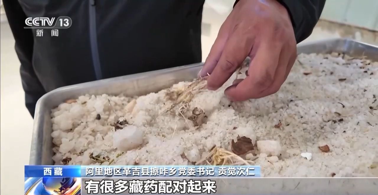 阿里地區(qū)革吉縣擦咔鄉(xiāng)黨委書記 貢覺次仁:這個(gè)就是足療鹽的原料,除了鹽以外還有很多藏藥,將原料先做初步的粉碎,然后進(jìn)行混合,最后磨成跟面粉一樣。