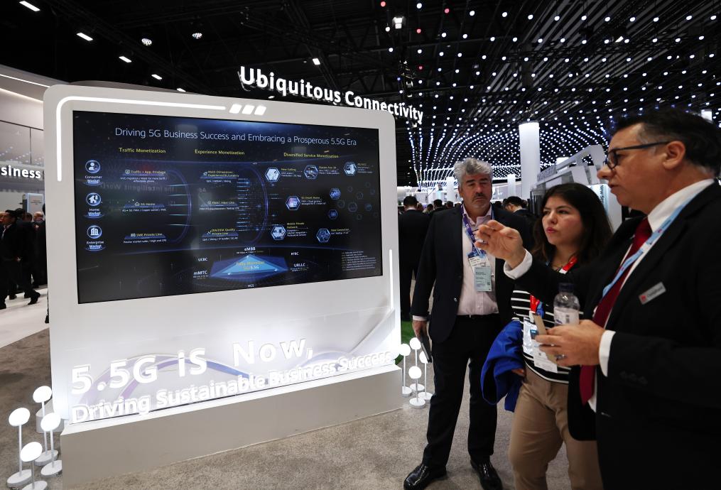 2月28日,在西班牙巴塞羅那舉行的2024年世界移動(dòng)通信大會(huì)上,人們?cè)谌A為展臺(tái)關(guān)注5G-A技術(shù)。新華社記者高靜 攝