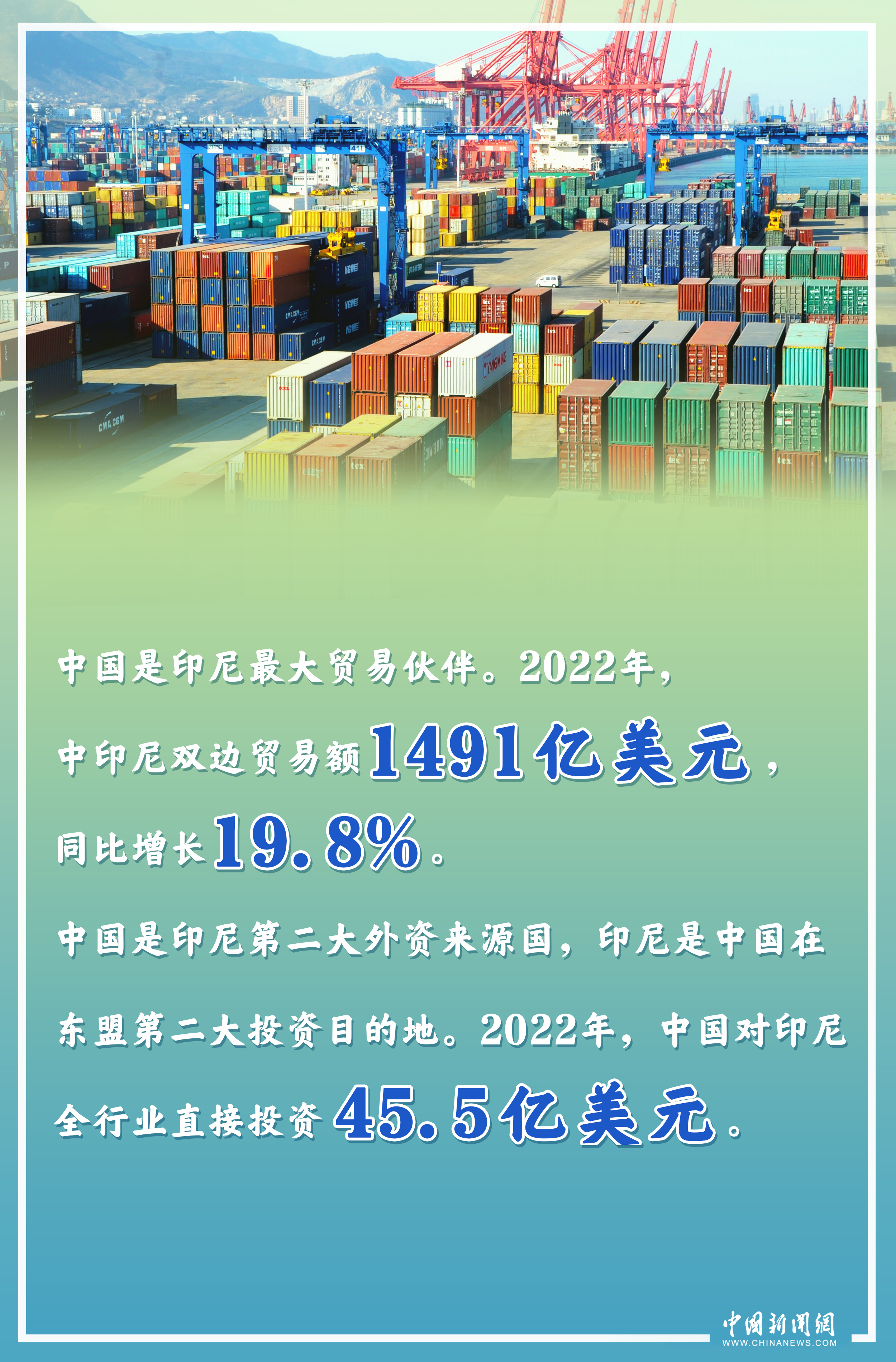 中國是印尼最大貿(mào)易伙伴。2022年,中印尼雙邊貿(mào)易額1491億美元,同比增長19.8%。中國也是印尼第二大外資來源國,印尼是中國在東盟第二大投資目的地。2022年,中國對印尼全行業(yè)直接投資45.5億美元。