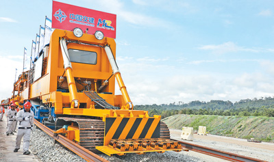 在馬來西亞彭亨州關丹市馬東鐵項目現場,鋪軌機正在作業(yè)。