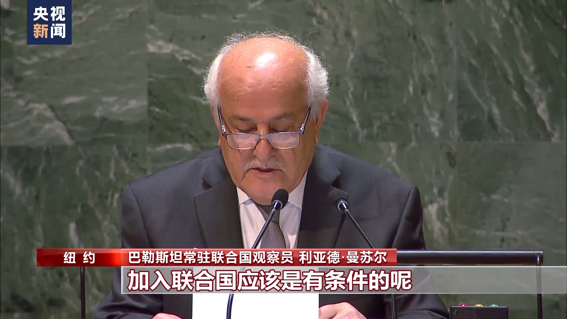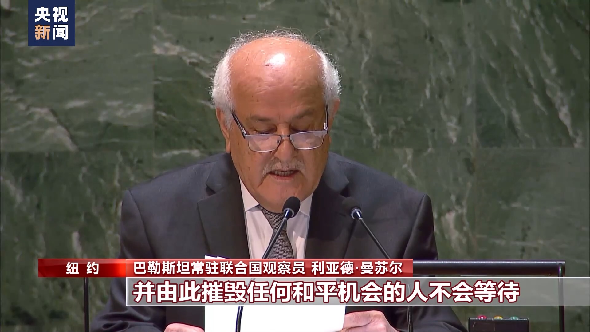 巴勒斯坦常駐聯(lián)合國觀察員 利亞德·曼蘇爾:那些想要摧毀巴勒斯坦國,并由此摧毀任何和平機(jī)會的人不會等待。