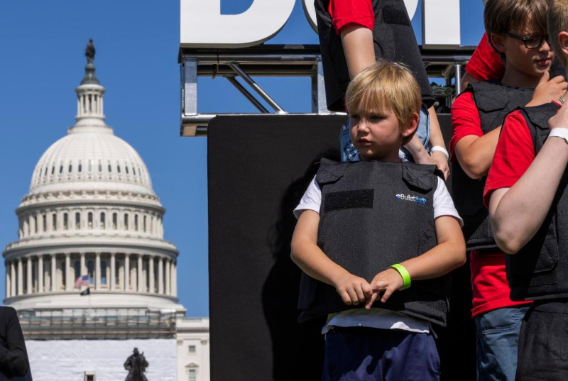 2022年6月6日,學(xué)生們身穿防彈衣在美國(guó)華盛頓的國(guó)會(huì)大廈前參加名為“不要回避”的抗議活動(dòng),呼吁立法機(jī)構(gòu)正視美國(guó)槍擊案頻發(fā)的社會(huì)問題,要求加強(qiáng)槍支管控立法。新華社發(fā)(亞倫攝)