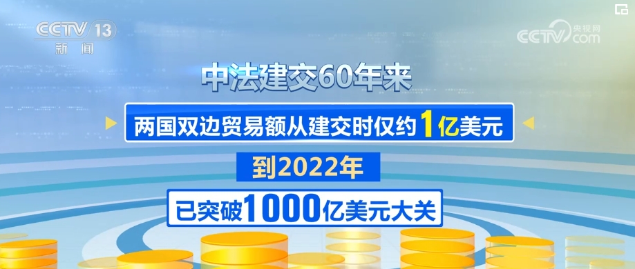 中法建交60年來,兩國雙邊貿(mào)易額從建交時(shí)僅約1億美元,到2022年已突破1000億美元大關(guān)。如今,法國是中國在歐盟內(nèi)第三大貿(mào)易伙伴和第三大實(shí)際投資來源國,中國則是法國在亞洲第一大貿(mào)易伙伴。