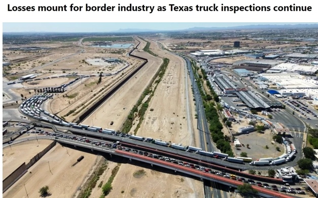近日,為應(yīng)對(duì)近期大規(guī)模移民潮,美國(guó)得克薩斯州政府在美墨邊境重新設(shè)置了隨機(jī)檢查站,宣布對(duì)進(jìn)入美國(guó)的貨運(yùn)卡車進(jìn)行額外安全檢查,造成卡車嚴(yán)重?fù)矶隆?/p>