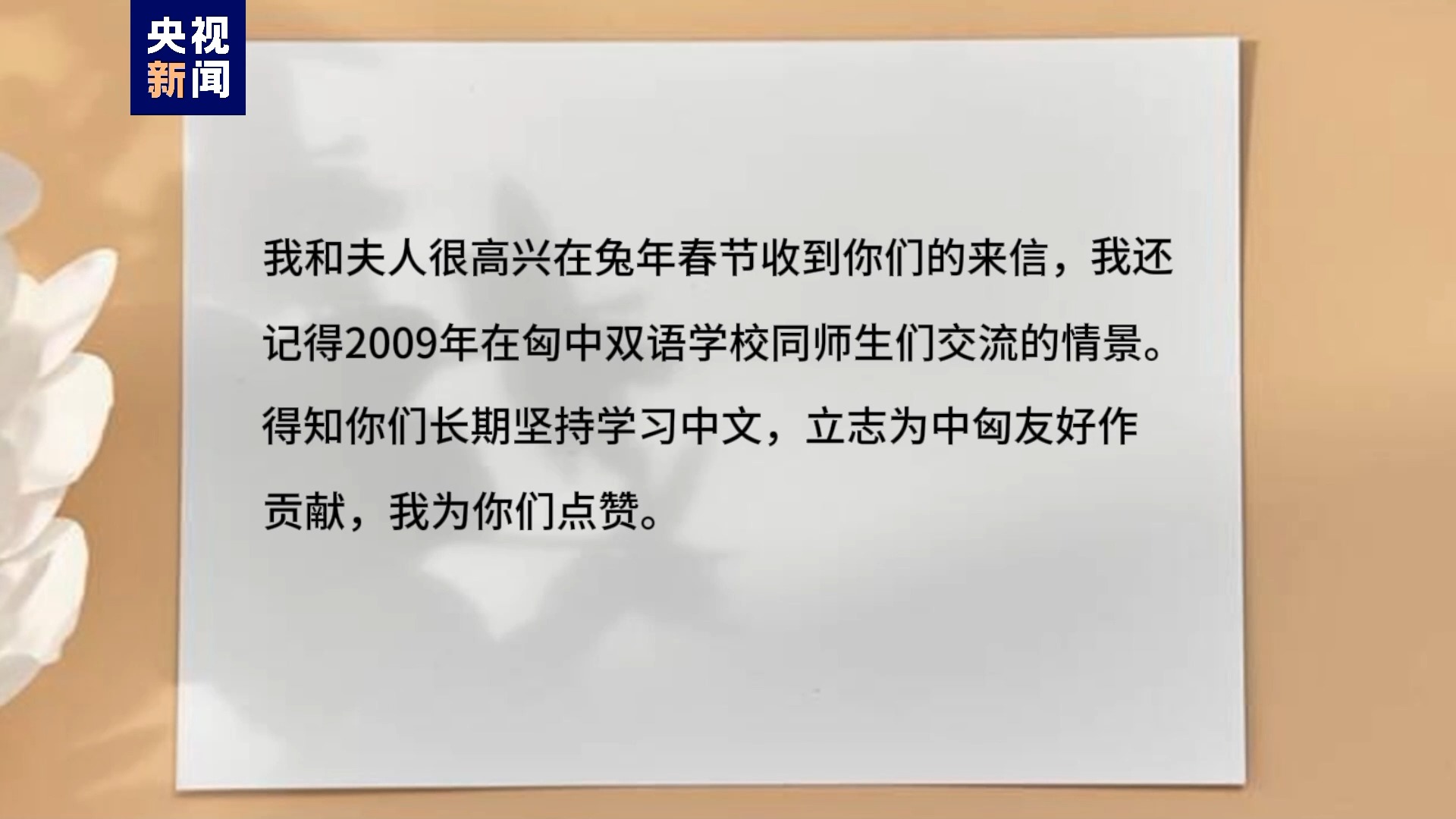 中國國家主席習近平在回信中寫道,他和夫人為在兔年春節(jié)前收到同學們的來信而感到高興,他還記得2009年在匈中雙語學校同師生們交流的情景。得知孩子們長期堅持學習中文,立志為中匈友好作貢獻,他為孩子們點贊。