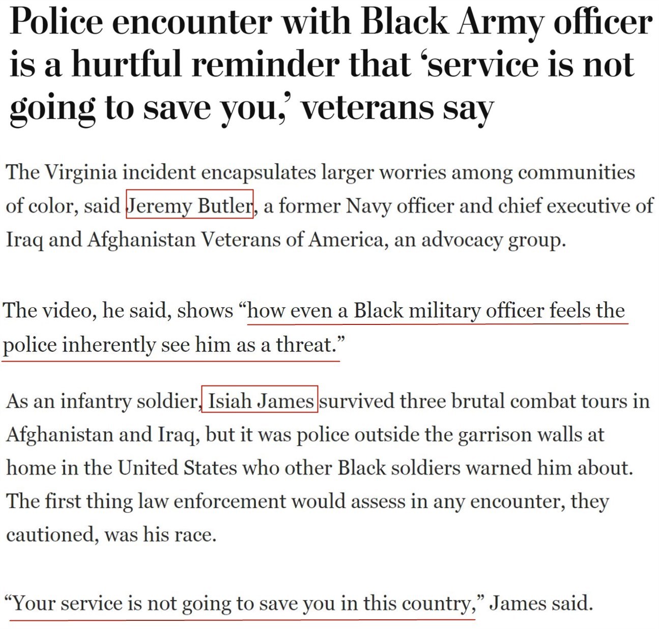 曾在阿富汗和伊拉克的三次殘酷戰(zhàn)斗中幸存下來的非裔美軍士兵伊塞亞·詹姆斯退役后,曾被其他非裔戰(zhàn)友“友情提醒”:打仗不是最可怕的,真正要小心的是美國警察,“在這個國家,即使在軍中服役也救不了你”。