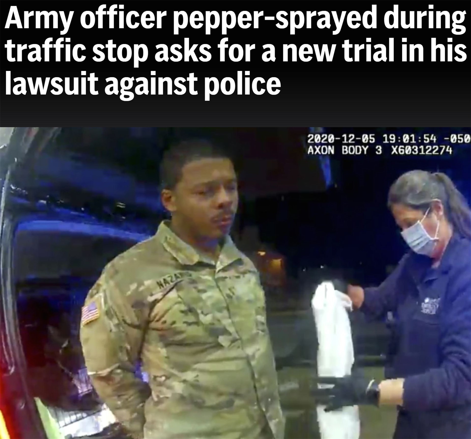 2020年12月,非洲和拉丁裔混血的美國陸軍少尉卡倫·納扎里奧在弗吉尼亞州溫莎市駕駛新買的汽車回家途中,遭遇兩名警察歧視性執(zhí)法。后者不僅以“無照駕車”為由用槍威逼納扎里奧下車,還對他進行毆打并使用胡椒噴霧。