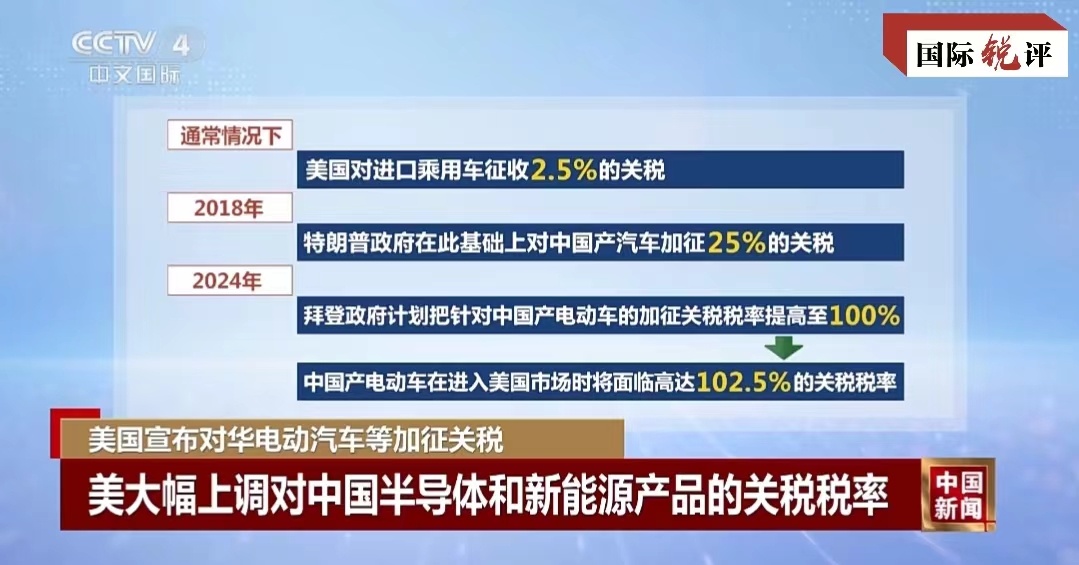 這其中,對中國電動汽車加征的進(jìn)口關(guān)稅令人瞠目——從27.5%升至102.5%,對太陽能電池的進(jìn)口稅從25%提高到50%,對鋰電池的關(guān)稅稅率從7.5%提高到25%。不難看出,美國政府此次針對的重點是中國新能源相關(guān)產(chǎn)業(yè)。難怪美國多名高官近期密集炒作所謂中國新能源“產(chǎn)能過?!保贿^是為加征關(guān)稅制造借口。