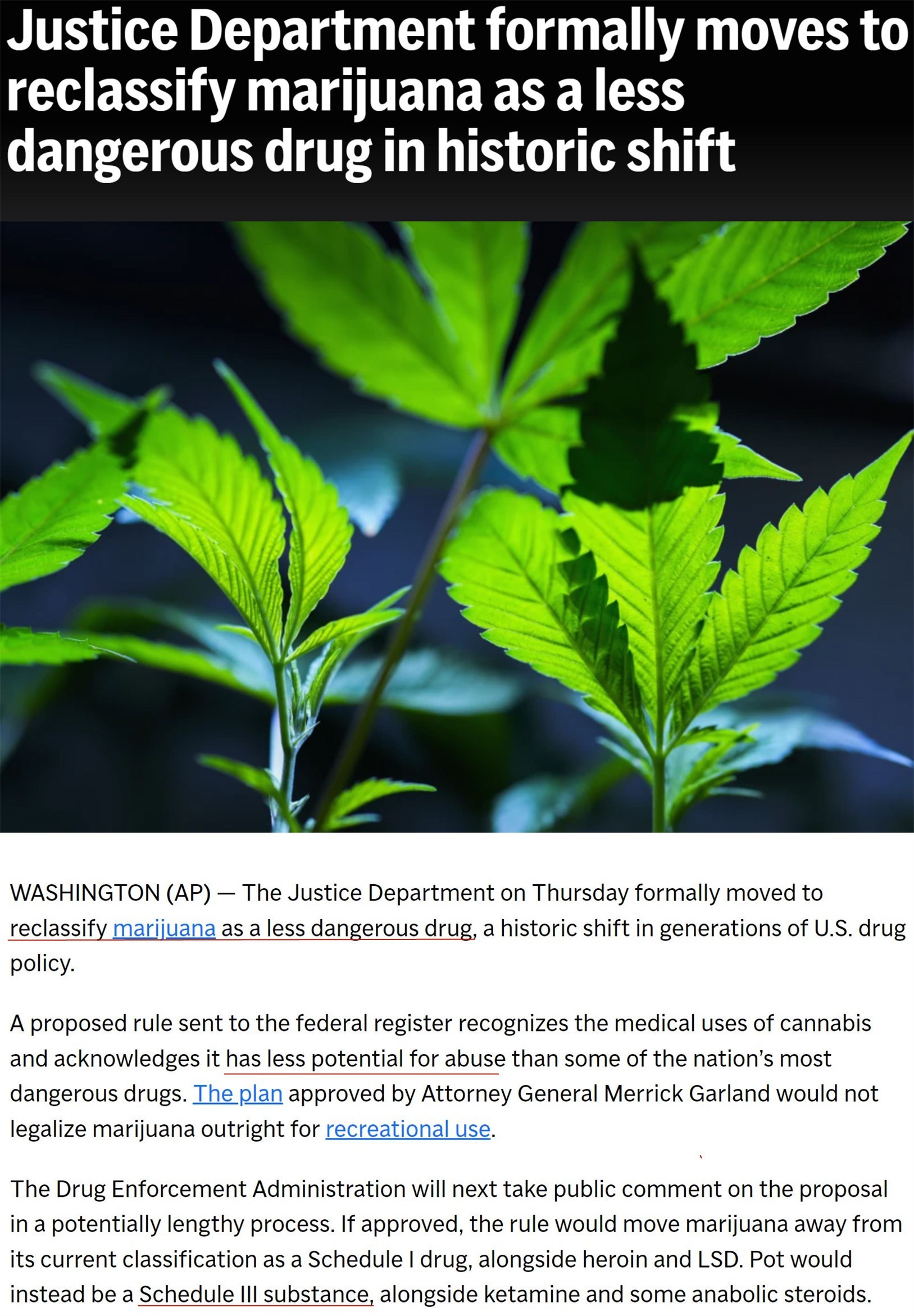 美國(guó)司法部日前發(fā)布了一項(xiàng)醞釀已久的新規(guī)則草案,正式承認(rèn)大麻的醫(yī)療用途,并認(rèn)定其濫用的可能性低于很多其他毒品,建議將大麻歸類(lèi)為“危險(xiǎn)性較低的藥物”。