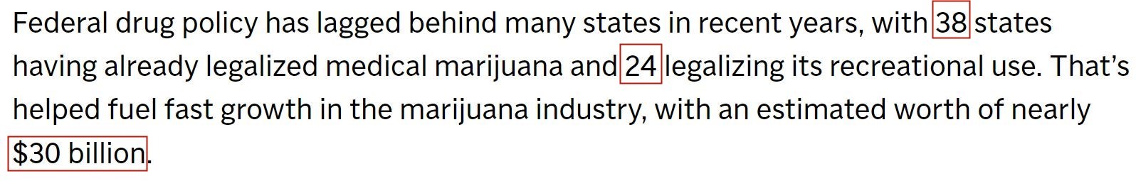 而在美國(guó),目前已有38個(gè)州(37個(gè)州和華盛頓特區(qū))將醫(yī)用大麻合法化,24個(gè)州(23個(gè)州和華盛頓特區(qū))將娛樂(lè)性大麻合法化。