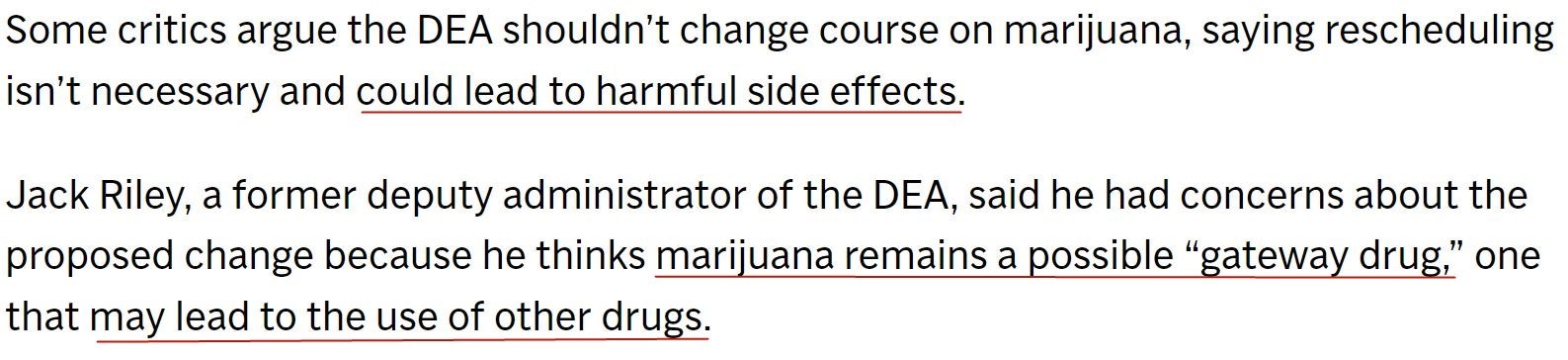 美國(guó)禁毒署前副署長(zhǎng)杰克·萊利對(duì)擬議中的規(guī)則更改感到擔(dān)憂。他認(rèn)為,大麻仍是一種“入門(mén)毒品”,可能導(dǎo)致對(duì)其他毒品的使用。