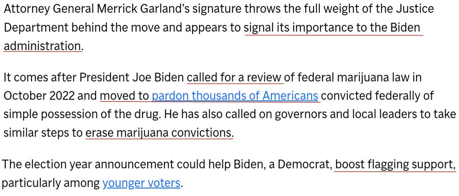 美聯(lián)社分析指出,美司法部對(duì)修改大麻分類(lèi)的全力支持,表明了此舉對(duì)拜登政府的重要性。拜登在大選前夕推動(dòng)大麻去罪化,就是為了吸引年輕選民的支持。