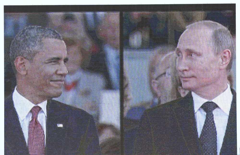 2014年6月6日,在法國諾曼底地區(qū)烏伊斯特勒昂,大屏幕播放前來參加諾曼底登陸70周年紀(jì)念儀式的俄羅斯總統(tǒng)普京(右)和美國總統(tǒng)奧巴馬(左)的影像。新華社/路透