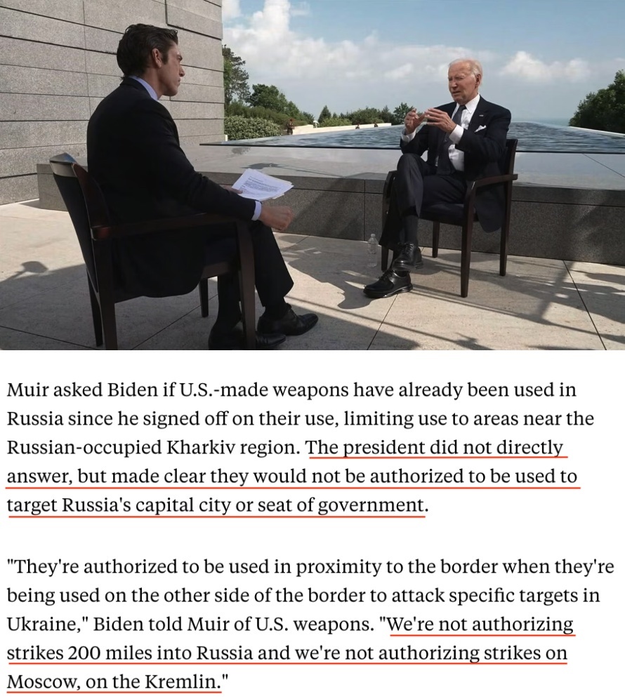 “它們(這些武器)被授權(quán)在(烏俄)邊境附近使用……我們沒有授權(quán)(烏克蘭)向俄羅斯境內(nèi)200英里(約合320公里)的地方發(fā)動襲擊,也沒有授權(quán)對莫斯科、克里姆林宮進行打擊。”