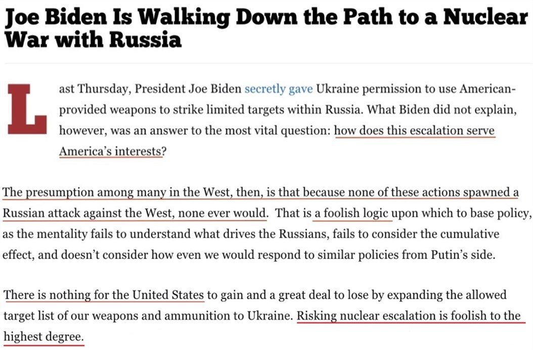 文章認為,允許烏克蘭擴大美援武器的打擊范圍對美國有百害而無一利。在美國安全并未受到威脅的情況下,冒險與俄羅斯爆發(fā)核戰(zhàn)爭簡直“蠢透了”。